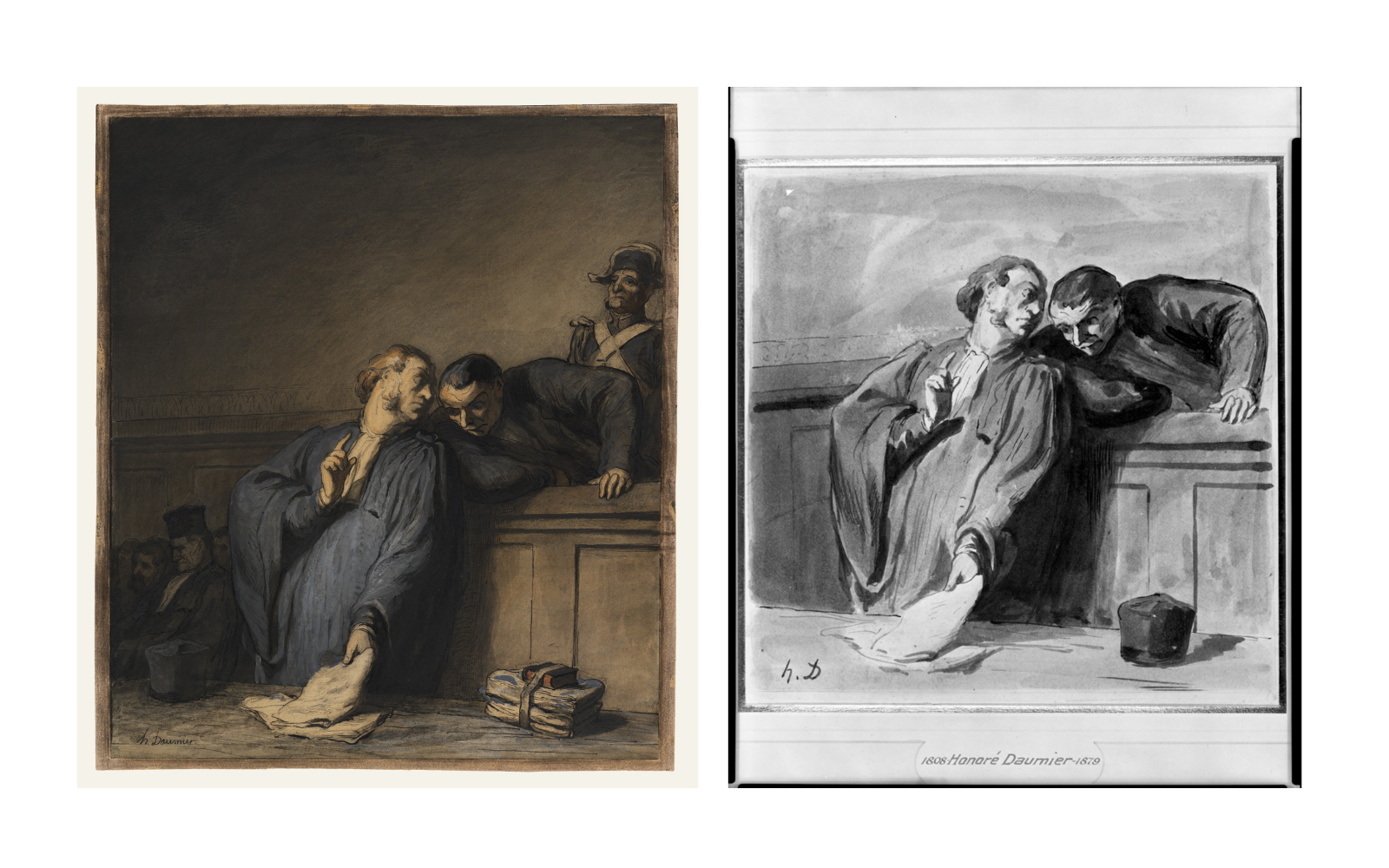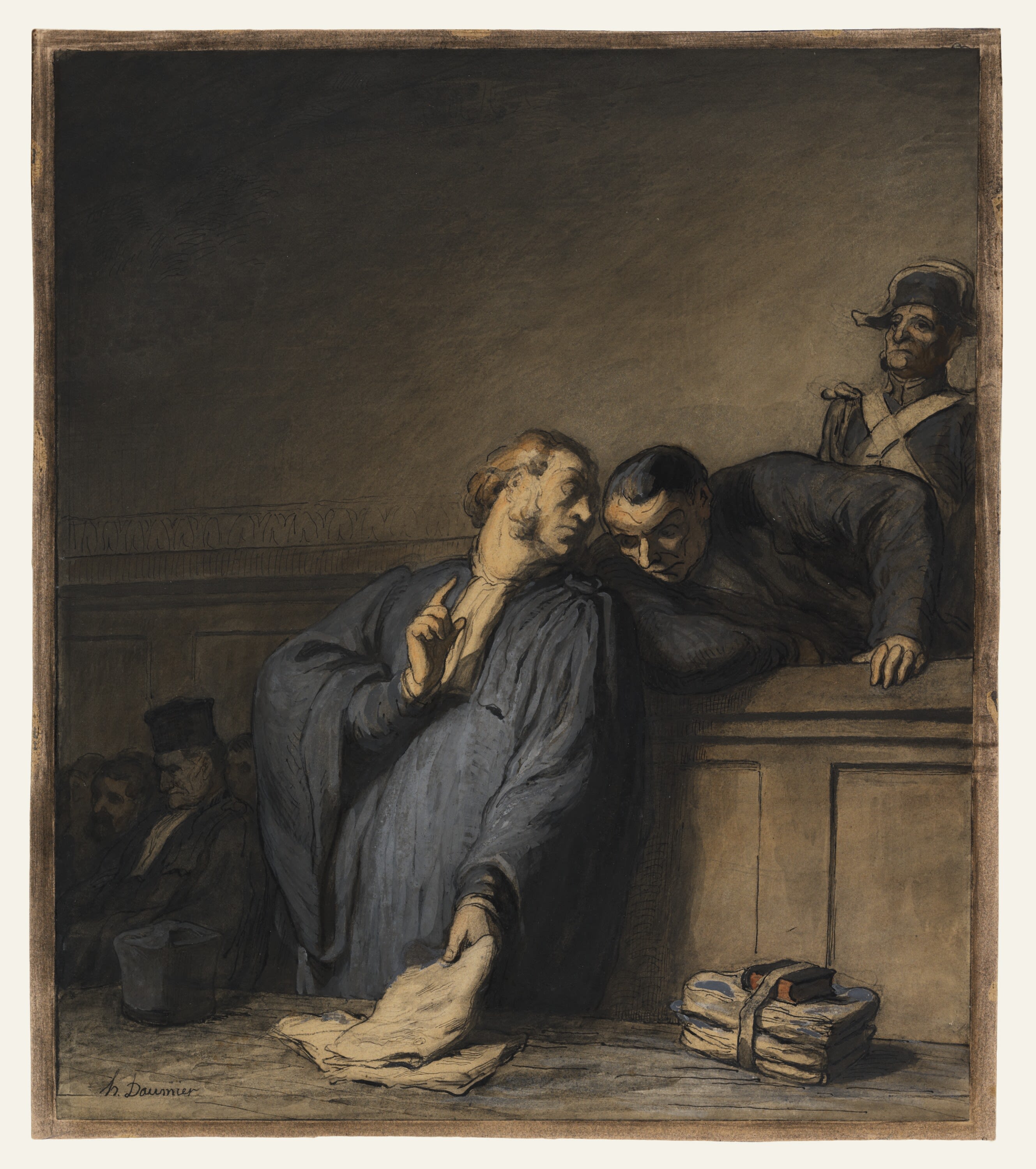 Right/Lower Image: Imitator of Honoré Daumier (1808–1879), Pleaders, Harvard Art Museums/Fogg Museum, Bequest of Grenville L. Winthrop