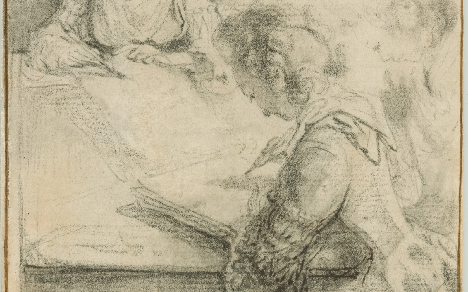 In this sheet by the indefatigable draughtsman Gabriel de Saint-Aubin we can imagine the mixture of quiet concentration, the scratching of chalk on paper, perhaps nervous chitter-chatter, as the women sit around the table engaged in their pastime: drawing. Their own sketches may or may not survive for us today, but Saint-Aubin captures the moment and hands it to us. His focus is on their elegant hairstyles and dresses. Although the drawing is swiftly made in black chalk, he uses brown ink to convey details of the dress nearest him and to accentuate the solidity of the table and chair: an inscription at lower right in ink charmingly notes of the principal figure that one of her feet is in the air: pied en l’air.
